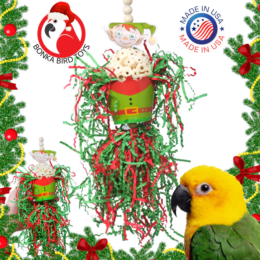The Sola Elf, Santa, Snowman, or Reindeer from Bonka Bird Toys lets your small to medium-sized cherished feathered friends embrace the Holiday Season with this excellent stocking stuffer. A colorful Christmas-themed comical cup depicting the above is stuffed with a natural Sola Atta ball (best seller) and adorned with red and green festive foraging crinkly paper. The Sola Elf, Santa, Snowman, or Reindeer Bird Toys offer multiple healthy play activities, engage their curious minds, and help alleviate the cage boredom through the Christmas period, a true holiday gift that will keep on giving. The Sola Elf, Santa, Snowman, or Reindeer Bird Toys are 100% bird safe, comes in bright bird-pleasing Christmas colors, weighs and measures approximately twelve (12) inches high by three and one half (3.50) inches wide, and weighs two (2) ounces. It has a quick link for easy placement in or out of the cage—an ideal gift for Cockatiels, Parakeets, Conures, and other similar birds.
